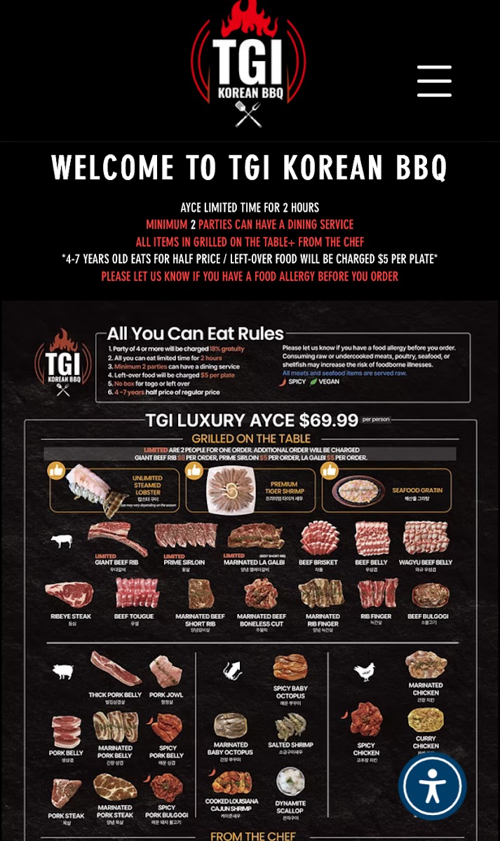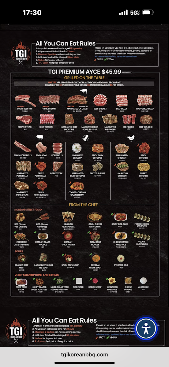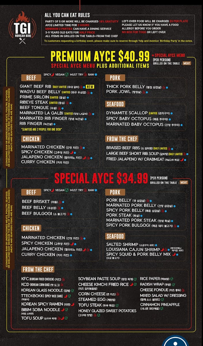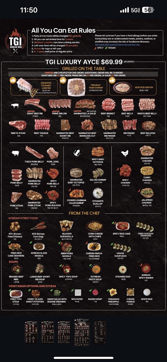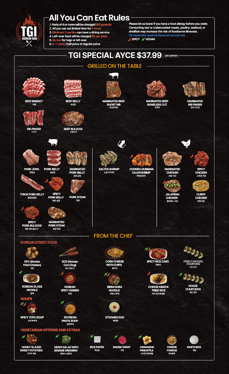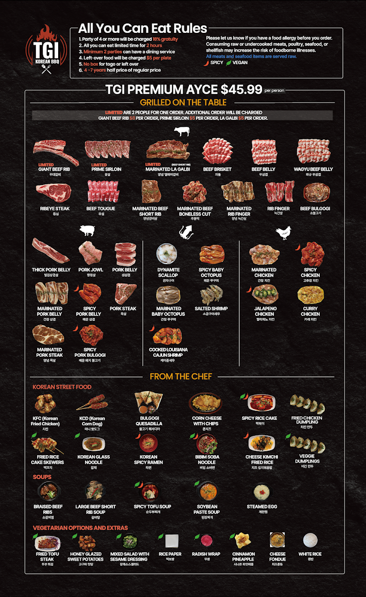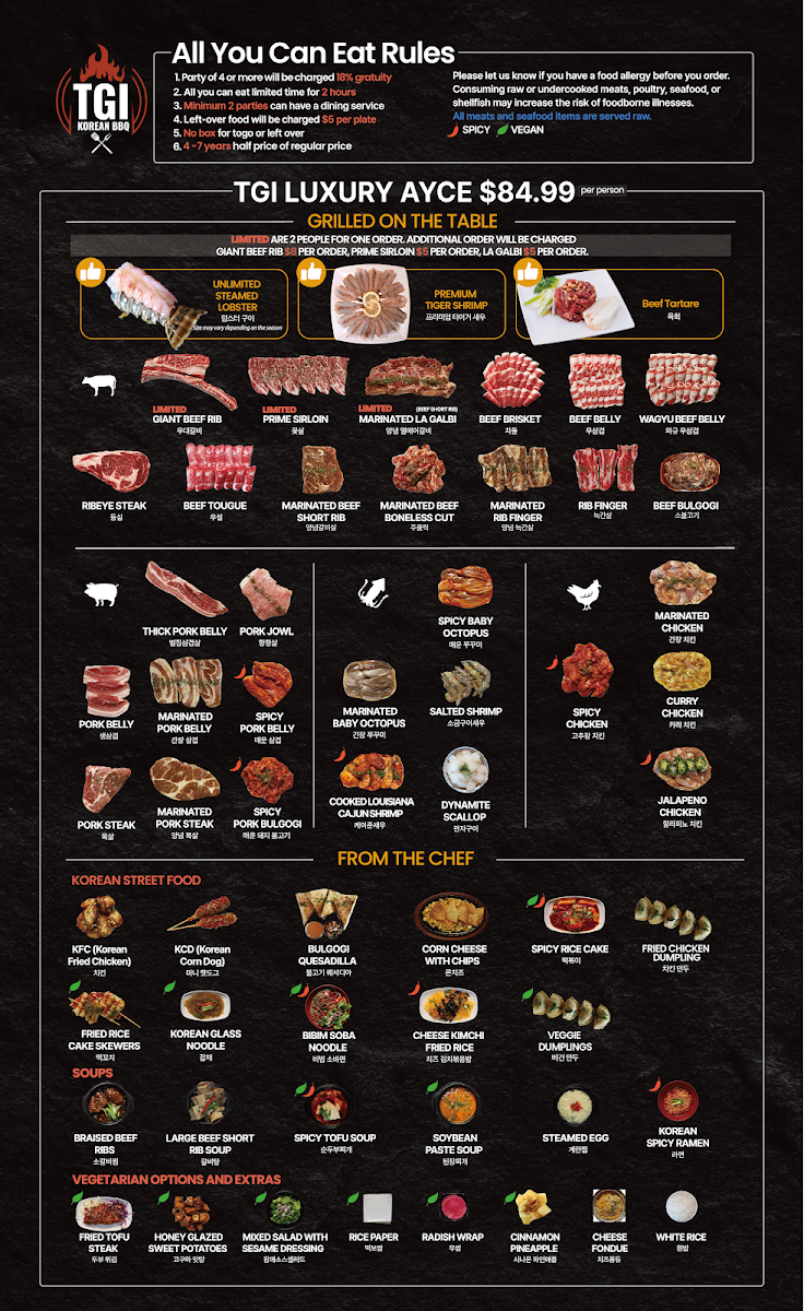 The essence of TGI Korean BBQ lies in its authentic Korean cuisine, with an impressive array of dishes that showcase the richness of flavors. Their menu features a variety of options perfect for any palate. Dive into their standout Unlimited Lobster Tails, a customer favorite that has patrons raving, or indulge in the decadent Spicy Pork Ribs W/Cheese that melds heat with comfort in every bite. With delightful choices like Giant Beef Short Rib, Korean Spicy Crab Stew, and Cheese Kimchi Fried Rice, each dish is crafted with care, ensuring a delicious experience that captures the essence of Korean barbecue.